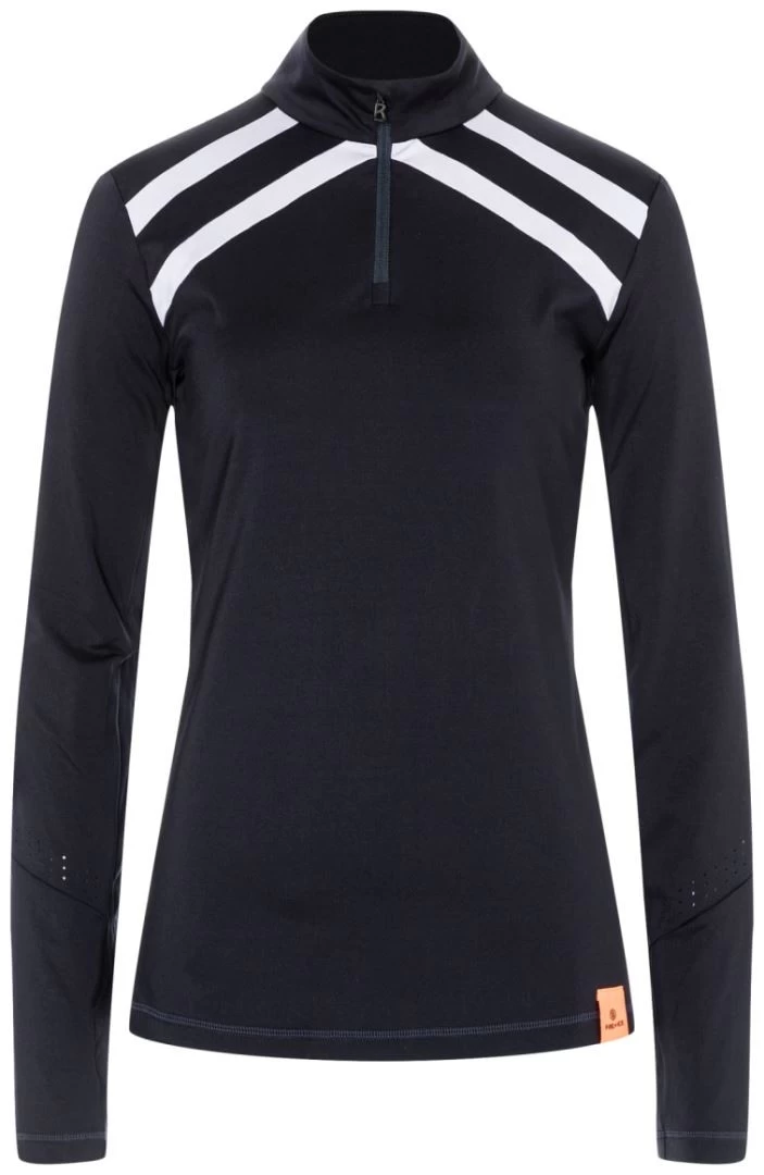 Functionele details, zoals geperforeerde mouwpanelen en een opstaande kraag met ritssluiting, karakteriseren de eerste laag van Sancha als een high-performance stuk, wat wordt benadrukt door de stof van comfortabel lichtgewicht powerstretch. De zacht geborstelde achterkant zorgt voor meer comfort, terwijl contrasterende elementen en logotape op de achterkant highlights toevoegen.